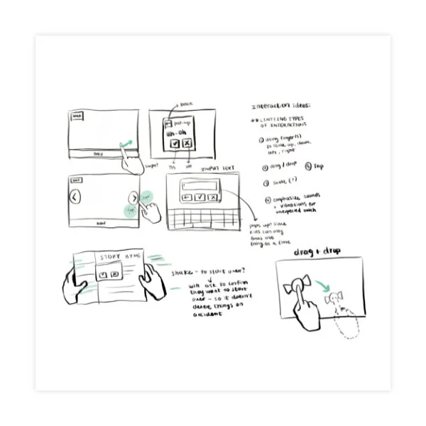 We started to sketch ideas based on our user research. We played with simple gestures and fun interactive screens.